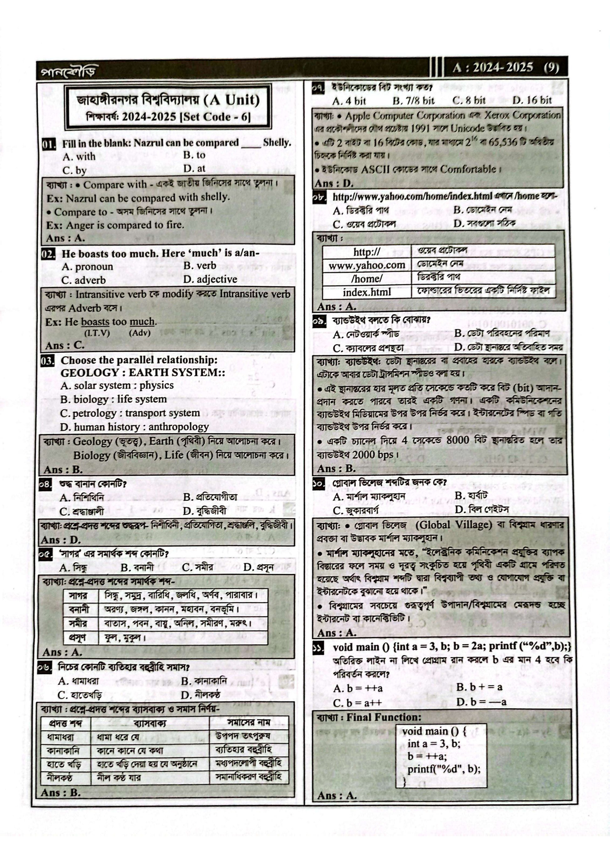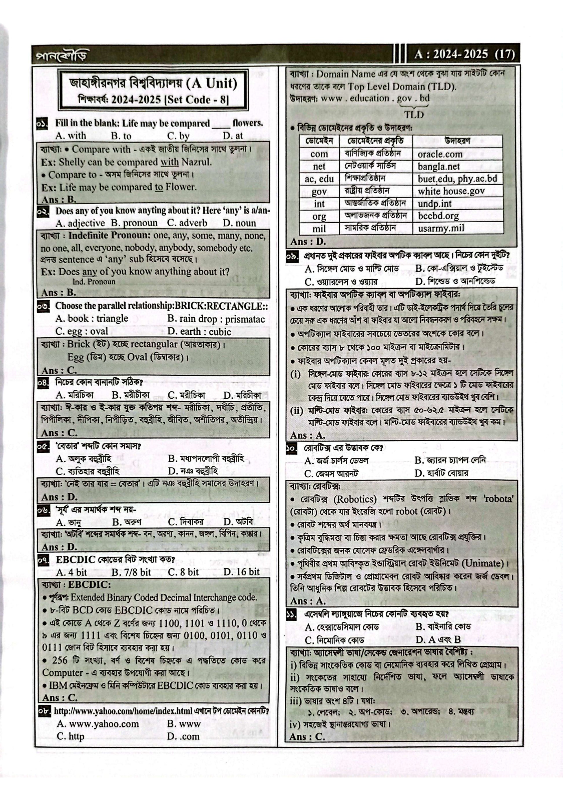 জাহাঙ্গীরনগর বিশ্ববিদ্যালয় UNIT-A (EX-A H Unit) ( গাণিতিক ,পদার্থ বিষয়ক এবংআইটি) অনুষদের শতভাগ ব্যাখ্যা সম্বলিত একমাত্র প্রশ্নব্যাংক